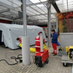 Der erste Teil beinhaltete die Einweisung in den Fahrzeugaufbau und das Material welches auf dem Fahrzeug verladen ist, im zweiten Teil wurde der praktische Umgang mit dem Material und der Technik geübt. Hierfür wurde das aufblasbare Zelt aufgestellt, Licht und Zeltheizung installiert und ein Behandlungsplatz mit Tragen und Lagerungsböcken sowie Beatmungsgeräten aufgebaut. Außerdem erhielten die Helfer die in Besitz einer gültigen Fahrerlaubnis für dieses Fahrzeug sind, eine Fahrzeugeinweisung.